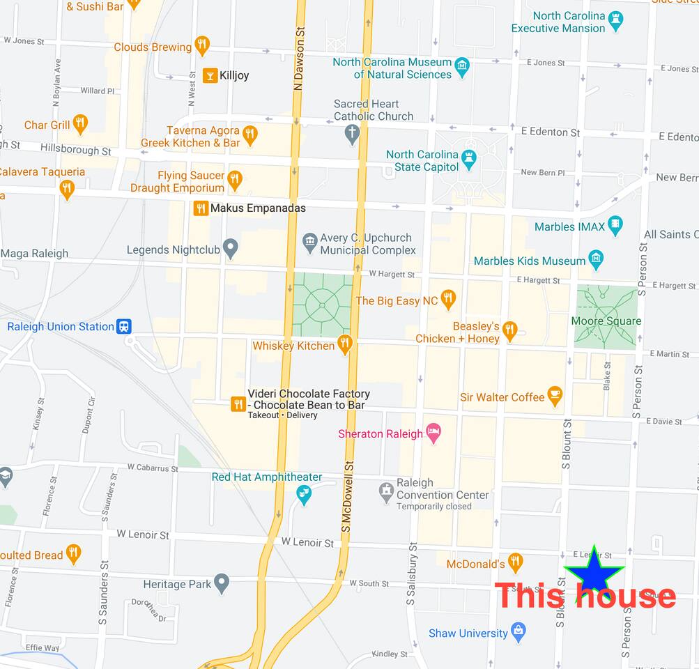 This house is located in the historic Prince Hall neighborhood and is right across the street from Shaw University. Located within the original boundaries of downtown Raleigh from the 1700s, this house is close to everything. You are less than a 10-minute walk from the Duke Energy Center for the Performing Arts, Convention Center, Red Hat Amphitheater, and Moore Square. Walk to anywhere on Fayetteville Street in 20 minutes or less.